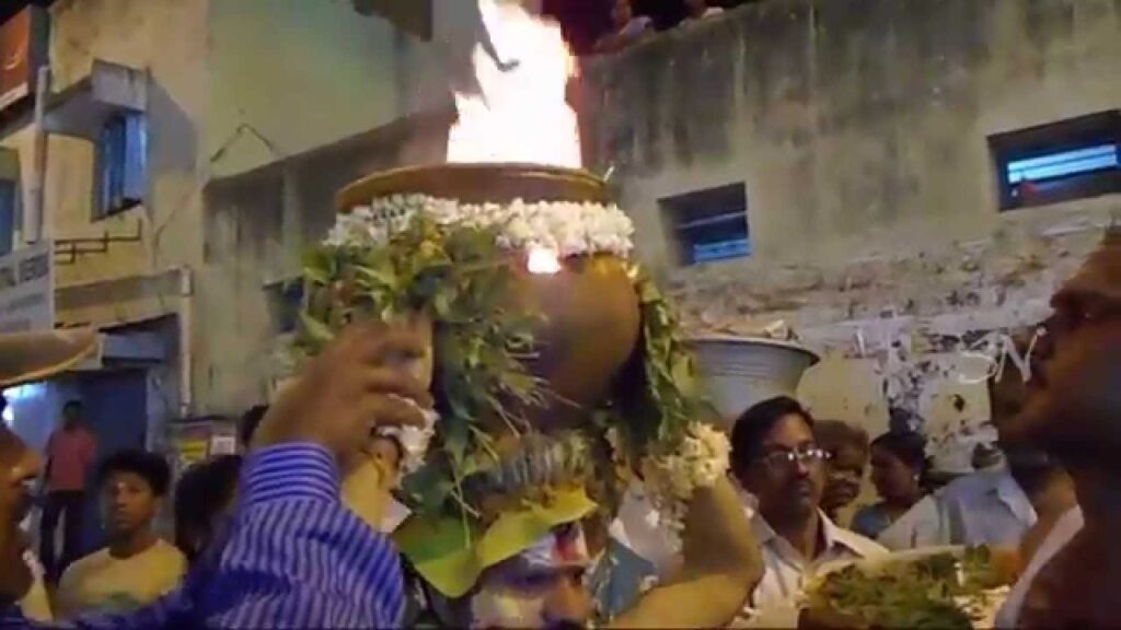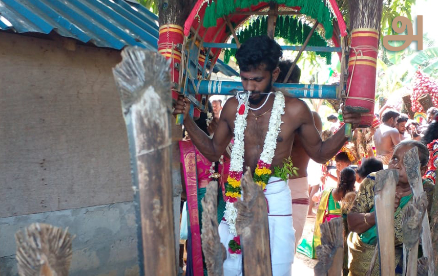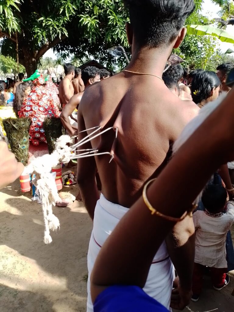 J’ai prié Dieu pour ma sœur. Le mariage de ma sœur a été reporté pour certaines raisons, j’ai promis à Virabhadra que si le mariage de ma sœur se passe bien, je me percerai le dos avec les crochets et prendrai le Kavadi sur la tête pour régler ma dette envers lui. (Le Kavadi est à la fois le nom du rituel et celui de l’objet qui est porté au-dessus de la tête)