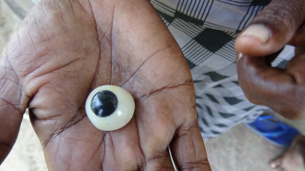 Je l’enlève avant de me coucher le soir. Quand je me réveille le matin, je le remets. Quand je sors sans le porter et que quelqu’un me voit dehors, il me fixe et les enfants ont peur. Alors pour éviter ça, je porte ce faux œil pour qu’on ne me regarde pas avec mépris. J’ai une petite boîte dans laquelle je mets l’œil quand je le retire. Il existe une méthode pour le garder propre, des éponges et quelques médicaments. Mais je n’ai pas assez d’argent pour acheter tout ça. Donc je le nettoie avec les vêtements que je porte. Je n’ai pas les moyens de l’entretenir.