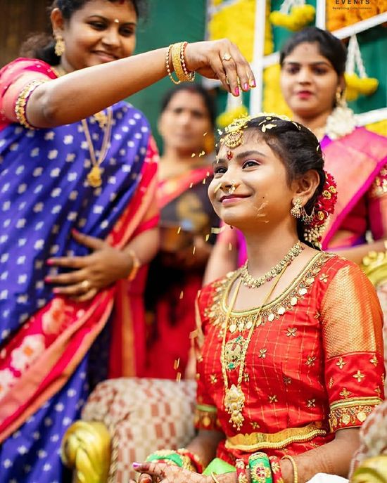 Si une fille a atteint la puberté, elle est gardée dans un endroit isolé ou dans une pièce séparée. Ensuite, les parents viendront la visiter. La mère et la tante de la fille toucheront sa tête. Ensuite, les parents préparent le pongal (nourriture) et le servent à tout le monde. Puis, les parents qui viennent pour l’événement donneront des cadeaux et de l’argent à la fille. Jusqu’au 31e jour, la petite fille aura des aliments différents de ceux qu’elle mange habituellement. Pour la nourriture, nous n’utiliserons pas de piment en poudre, mais un autre type de poudre. Nous n’utiliserons pas d’huile de noix de coco, mais de l’huile de sésame. Les parents donneront un œuf et de l’huile de sésame à boire tous les matins. Du jour de la puberté aux cinq premiers jours, une boule contenant du curcuma, des graines de cumin, du gingembre, des feuilles de neem (petit arbre) est préparée et donnée à la fille à avaler. De cette façon, jusqu’au 31e jour, la jeune fille ne recevra que des aliments sains et nutritifs. Elle sera laissée dans une pièce séparée où personne ne pourra la voir et ne sera pas autorisée aller à l’extérieur. Si elle doit sortir pour se laver ou aller aux toilettes, elle le fera avec un morceau de fer à la main. Le morceau de fer et le neem sont liés ensemble. Parce que pendant cette période, aucun esprit malfaisant ne devrait s’approcher de cette femme. (Selon la croyance des Tamouls, le fer a le pouvoir de résister aux démons, aux mauvais esprits, etc. Les mauvais esprits ne s’approchent pas de l’endroit où se trouve un morceau de fer) Ainsi, lorsque la jeune fille sort, elle doit le porter dans sa main. Puis, quand elle arrive dans sa chambre, elle doit le mettre sous son oreiller.