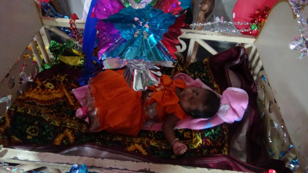 C’est le rituel durant lequel nous nourrissons l’enfant pour la première fois au 6e mois après la naissance. L’enfant est emmené au temple et l’oncle maternel de l’enfant prend de la nourriture et nourrit l’enfant trois fois. Après cela, les enfants sont gardés à la maison et nourris normalement.